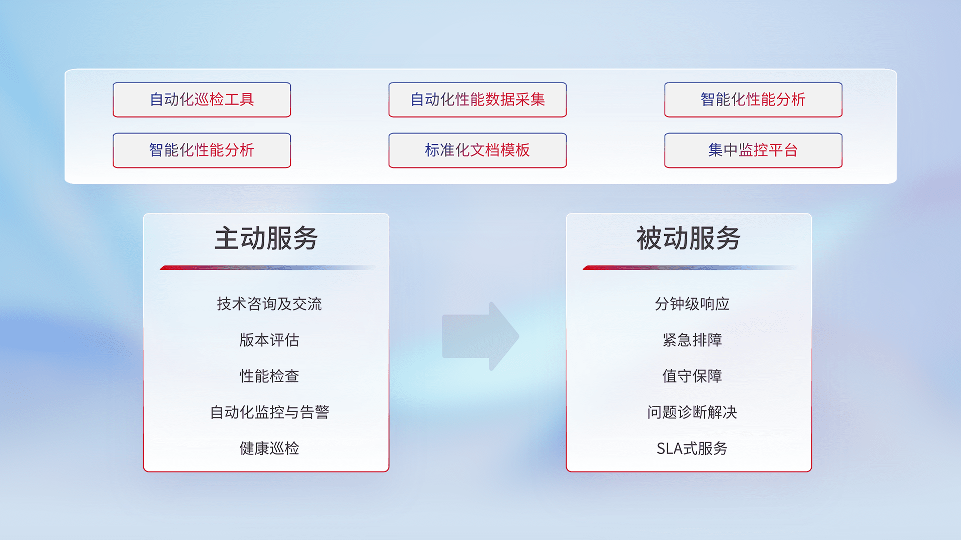 智能化工具和标准化文档,,保障服务质量,,,,提供主动服务(包含技术咨询、、版本评估、、性能检查、、、自动化监控与告警、、、、健康巡检)和被动服务包含(分钟级响应、、、、紧急排障、、值守保障、、、问题诊断解决、、、SLA服务)。。