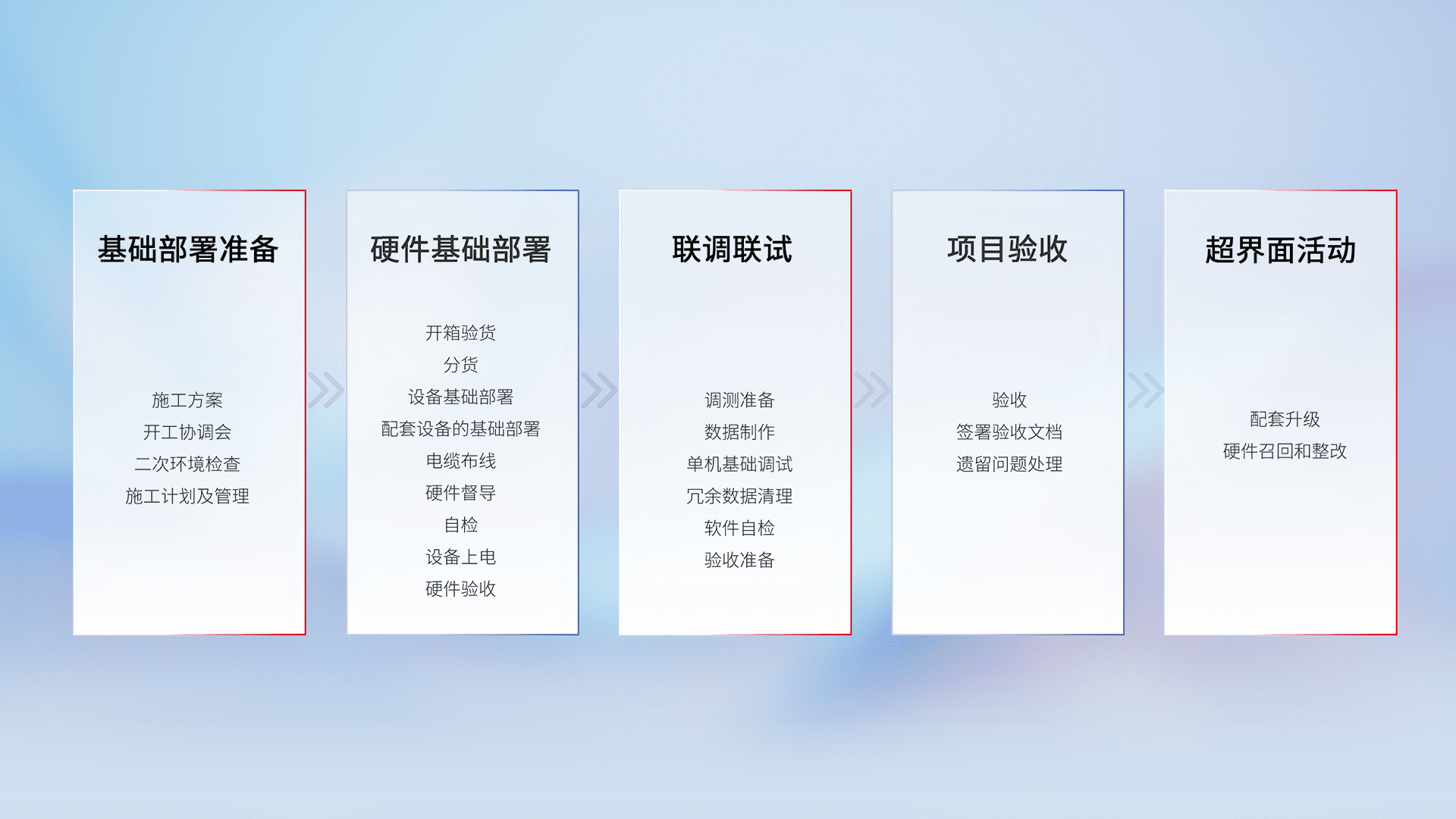 从基础部署准备、、硬件基础部署、、、联调联试、、项目验收、、越界面活动的全过程可追溯,,保证施工质量和进度。。。